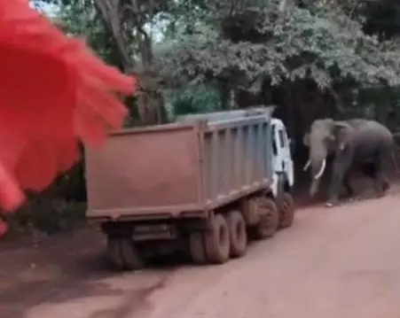 CG : दंतेल हाथी ने हाईवा ट्रक का रास्ता रोका ड्रायवर ने जान बचा कर भगा