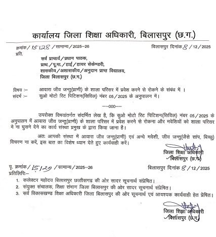 जिला शिक्षा अधिकारी के द्वारा लेटर 8 दिसंबर को जारी किया गया है। इस लेटर में लिखा है- ‘आवारा जीव जंतु, के शाला परिसर में प्रवेश करने से रोकना और मवेशियों को शाला परिसर में ना घुसने देने का कार्य संश्ता प्रमुख के द्वारा किया जाना है। अत: आपकी संस्था में आवारा जीव जंतु एवं एन्य मवेशी, जीव जंतु जैसे की सांप बिच्छू विचरण नहीं करे इस बात का विशेष ध्यान देते हुए कार्यवाही करें।’