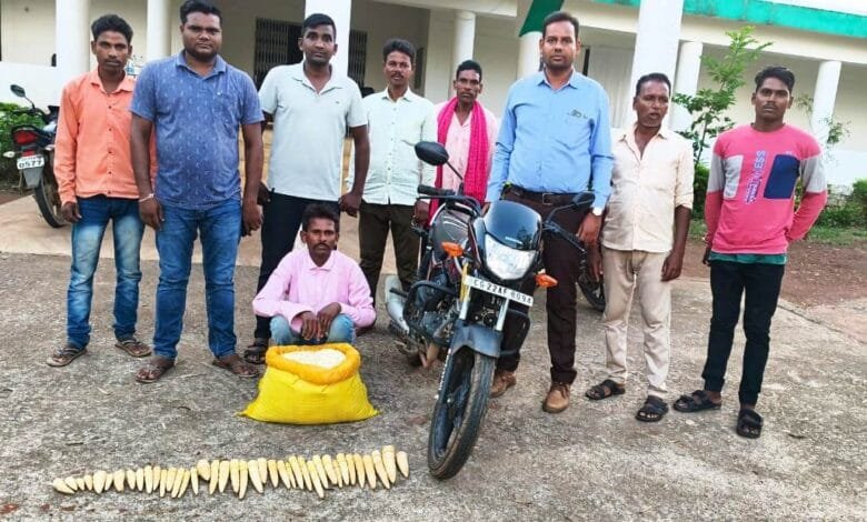 प्राप्त जानकारी के अनुसार बलौदाबाजार-भाटापारा जिले के वन परिक्षेत्र अधिकारी रूपेन्द्र कुमार साहू के नेतृत्व में महराजी सर्कल के वन कर्मचारियों एवं सुरक्षा श्रमिकों द्वारा की गई नियमित गश्त के दौरान प्रवीण कुमार पटेल पिता भनेश राम पटेल, उम्र 37 वर्ष, निवासी ग्राम गिरौदपुरी, को मोटरसाइकिल (होंडा साइन, क्रमांक CG22 AF 8094) में बांस करील एवं बांस पिका का अवैध रूप से परिवहन करते हुए रंगे हाथ पकड़ा गया। मौके पर ही वाहन एवं बांस करील एवं पिका को जप्त कर पी.ओ. आर. दर्ज की गई। बरामद नासवान बांस करील एवं पिका को नियमानुसार गड्ढा खोदकर नष्ट किया गया। साथ ही संबंधित के विरूद्ध विभागीय कार्यवाही की जा रही है।
