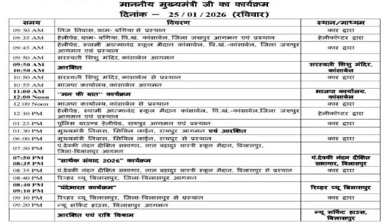 CG : मुख्यमंत्री विष्णुदेव साय आज जशपुर और बिलासपुर के कई कार्यक्रमों में शामिल होंगे…