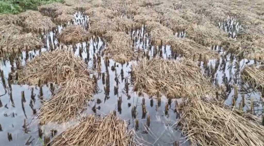 कवर्धा. छत्तीसगढ़ में बेमौसम बारिश किसानों के लिए आफत बन गई है. लगातार हो रही बारिश से कई खेतों में पानी भर गया है. इसके चलते धान की कटाई के बाद खेतों में रखी फसल सड़ने लगी है. वहीं तेज आंधी और तूफान से खड़ी धान की फसल भी गिरने लगी है. पीड़ित किसानों ने सरकार से बर्बाद हुए फसलों की मुआवजा देने की मांग की है.
