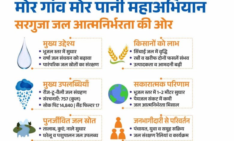 सरगुजा जिले में ‘मोर गांव मोर पानी‘ महा अभियान के तहत भू-जल स्तर में गिरावट को रोकने, वर्षा जल संचयन को प्रोत्साहित करने और पारंपरिक जल स्रोतों के संरक्षण के लिए व्यापक कार्य किए गए हैं। छत्तीसगढ़ शासन का उद्देश्य था कि प्रत्येक गांव अपने जल स्रोतों का संरक्षण कर जल आत्मनिर्भरता की दिशा में आगे बढ़े, ताकि आने वाले समय में जिले को जल संकट से मुक्ति मिल सके।