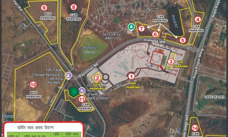 रायपुर, प्रधानमंत्री नरेन्द्र मोदी 01 नवम्बर को नवा रायपुर में आयोजित विभिन्न कार्यक्रमों में शामिल होंगे। इस दौरान नागरिकों और व्हीआईपी अतिथियों के सुरक्षित और सुगम आवागमन के लिए यातायात पुलिस रायपुर ने विशेष यातायात व्यवस्था की है। नवा रायपुर में आयोजित कार्यक्रमों में सम्मिलित होने वाले व्हीआईपी एवं नागरिकों के सुरक्षित एवं सुगम आवागमन तथा वाहनों की पार्किंग के लिए मार्ग व पार्किंग स्थल निर्धारित किया गया है। राज्योत्सव स्थल पहुंचने वालों की सुविधानुसार पहुंच मार्गों को 06 रूट में विभाजित किया गया है तथा प्रत्येक रूट में पार्किंग स्थल निर्धारित किया गया है जो निम्नानुसार है-