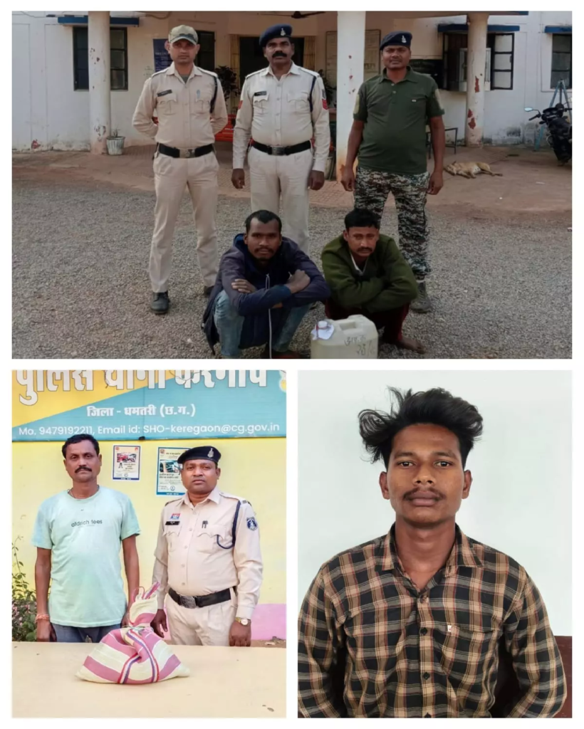 आरोपी (01) लोमन साहू, पिता मन्नू साहू, उम्र 39 वर्ष, निवासी ग्राम जामली, थाना मगरलोड, जिला धमतरी (छ.ग.) (02) गंगाधर नेताम, पिता सोहन नेताम, उम्र 26 वर्ष, निवासी ग्राम जामली, थाना मगरलोड, जिला धमतरी (छ.ग.) तीसरी कार्यवाही थाना केरेगांव (अवैध शराब बिक्री) ग्राम नयापारा कुकरेल में आरोपी द्वारा अपने घर के पास अवैध रूप से देशी महुआ शराब बिक्री किए जाने की सूचना पर थाना केरेगांव पुलिस द्वारा दबिश दी गई। आरोपी के कब्जे से 3.20 लीटर देशी कच्ची महुआ शराब एवं बिक्री रकम सहित कुल 520/-रूपये जप्त कर धारा 34(ए) आबकारी अधिनियम के तहत वैधानिक कार्यवाही की गई। आरोपी का विवरण नाम – पुरूषोत्तम निषाद पिता का नाम – स्व० परउ राम निषाद, उम्र – 46 वर्ष पता – नयापारा कुकरेल, थाना केरेगांव, जिला धमतरी (छ.ग.)
