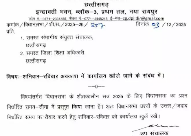 लोक शिक्षण संचालनालय की ओर से तमाम संभागीय संयुक्त संचालक और जिला शिक्षा अधिकारियों को आदेश जारी किया गया है. इसमें विधानसभा के प्रश्नों का उत्तर निर्धारित समय पर तैयार करने के लिए कार्यालयों को शनिवार और रविवार को भी खोलने का निर्देश दिया गया है.