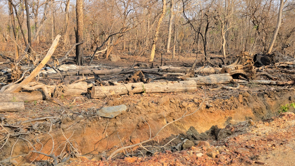 पीएमजीएसवाय विभाग के ठेकेदार ने सड़क निर्माण के दौरान पोकलेन मशीन से बेशकीमती सागौन के पेड़ों के अलावा इमारती पेड़ो को भी गिरा दिया।वंही जंगल मे गिरे सागौन के पेड़ो को आग के हवाले कर दिया।जिससे लाखो के सगौन राख में तब्दील हो गए।।