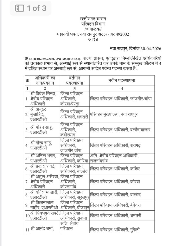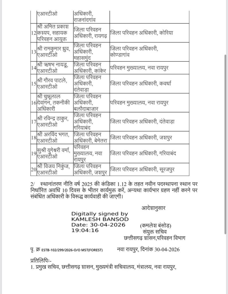 छत्तीसगढ़ परिवहन विभाग में बड़ा फेरबदल, 20 RTO अधिकारियों का तबादला