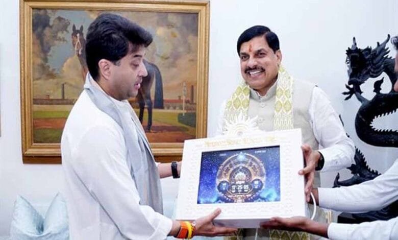 मुख्यमंत्री डॉ. यादव ने केंद्रीय मंत्री सिंधिया से मुलाक़ात कर भेंट की वैदिक घड़ी