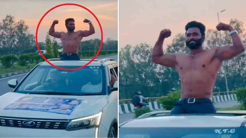 हापुड़ पुलिस ने दिल्ली-लखनऊ हाईवे NH-9 पर चलती कार की सनरूफ से बाहर निकलकर अर्धनग्न हालत में स्टंट करने वाले एक युवक के खिलाफ 21,500 रुपये का ऑनलाइन चालान काटकर कार्रवाई की है. गढ़मुक्तेश्वर कोतवाली क्षेत्र में युवक ने तेज रफ्तार कार में गाने बजाकर हंगामा किया, जिसका वीडियो पीछे चल रहे राहगीर ने बनाकर सोशल मीडिया पर वायरल कर दिया. यातायात पुलिस ने वीडियो का संज्ञान लेकर तत्काल एमवी एक्ट के अंतर्गत गाड़ी का चालान किया.