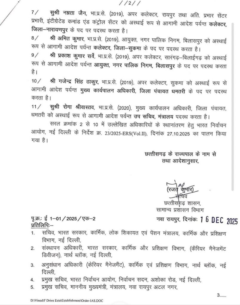 7/ नम्रता जैन, भा.प्र.से. (2019), अपर कलेक्टर, रायपुर तथा अति. प्रभार सेंटर प्रभारी, इंटीग्रेटेड कमांड एंड कंट्रोल सेंटर को अस्थाई रूप से आगामी आदेश पर्यन्त कलेक्टर, जिला-नारायणपुर के पद पर पदस्थ करता है।