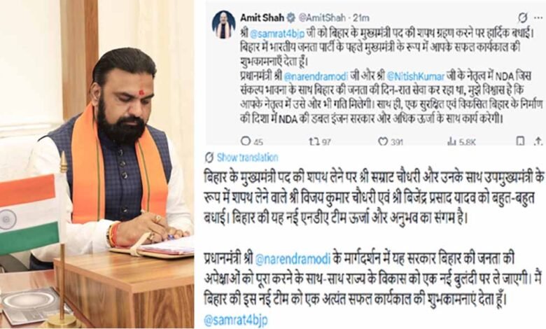 सम्राट चौधरी के बिहार के मुख्यमंत्री के तौर पर शपथ लेने पर, BJP के प्रदेश अध्यक्ष संजय सरावगी ने कहा, “2047 तक ‘विकसित भारत’ बनाने के प्रधानमंत्री के विज़न के तहत, नए मुख्यमंत्री सम्राट चौधरी के नेतृत्व में बिहार भी एक विकसित राज्य बनेगा। नीतीश कुमार द्वारा बिहार में स्थापित कानून का राज और उनके द्वारा तय किए गए विकास के रास्ते को सम्राट चौधरी आगे बढ़ाएंगे। बहुत-बहुत बधाई।”