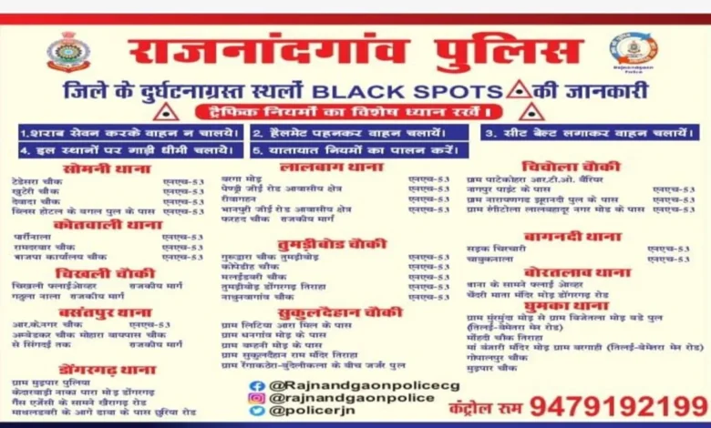 जिले में लगातार बढ़ रही सड़क दुर्घटनाओं पर प्रभावी नियंत्रण एवं रोकथाम के उद्देश्य से राजनांदगांव पुलिस द्वारा अत्यधिक दुर्घटनाजन्य स्थलों की पहचान की गई है।