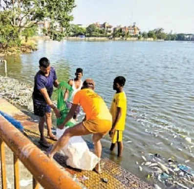 राजनांदगांव. शहर की ऐतिहासिक धरोहर बूढ़ासागर तालाब में फैली गंदगी और मछलियों की मौत की खबर सामने आने के बाद आखिरकार निगम प्रशासन हरकत में आया। शनिवार को नगर निगम, मत्स्य विभाग और तालाब को लीज पर लेने वाले ठेकेदार की संयुक्त टीम ने तालाब में सफाई अभियान चलाया। टीम ने मृत मछलियों, प्लास्टिक, शैवाल व अन्य गंदगी को हटाया और पानी को साफ करने के लिए 10 क्विंटल चूना व पोटाश का छिड़काव किया।
