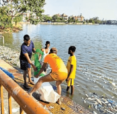 राजनांदगांव. शहर की ऐतिहासिक धरोहर बूढ़ासागर तालाब में फैली गंदगी और मछलियों की मौत की खबर सामने आने के बाद आखिरकार निगम प्रशासन हरकत में आया। शनिवार को नगर निगम, मत्स्य विभाग और तालाब को लीज पर लेने वाले ठेकेदार की संयुक्त टीम ने तालाब में सफाई अभियान चलाया। टीम ने मृत मछलियों, प्लास्टिक, शैवाल व अन्य गंदगी को हटाया और पानी को साफ करने के लिए 10 क्विंटल चूना व पोटाश का छिड़काव किया।