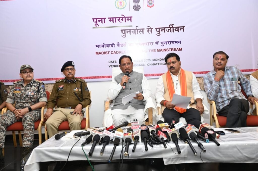 राजनांदगांव : मुख्यमंत्री ने पूना मारगेम : पुनर्वास से पुनर्जीवन अंतर्गत ग्राम कुम्ही में सीपीआई (मोओवादी) संगठन के 12 सक्रिय कैडरों द्वारा आत्मसमर्पण करने वाले माओवादी को मुख्यधारा में शामिल होने के संबंध में ली पत्रकार वार्ता