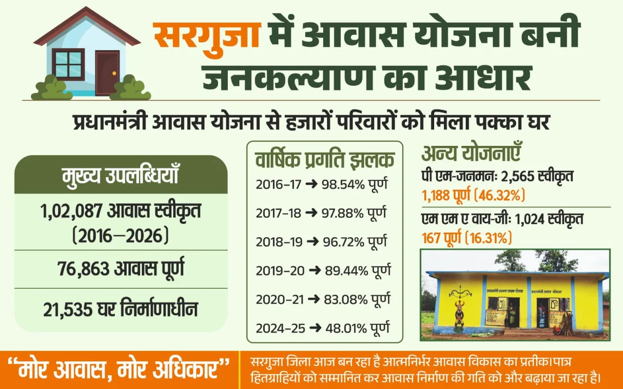 वर्ष 2016 से 2026 तक सरगुजा जिले में कुल 1,02,087 आवास स्वीकृत किए गए हैं, जिनमें से 76,863 आवासों का निर्माण पूर्ण हो चुका है। प्रारंभिक वर्षों में उल्लेखनीय सफलता दर्ज करते हुए 2016-17 से 2019-20 तक लगभग 90 प्रतिशत से अधिक आवासों का निर्माण पूरा किया गया। वर्तमान में 2024-25 के दौरान 32,087 आवासों में से 15,404 का निर्माण संपन्न हुआ है, जबकि 2025-26 के लिए 4,096 आवास स्वीकृत किए गए हैं, जिनकी पहली किस्त 1 नवम्बर से जारी कर दी गई है।