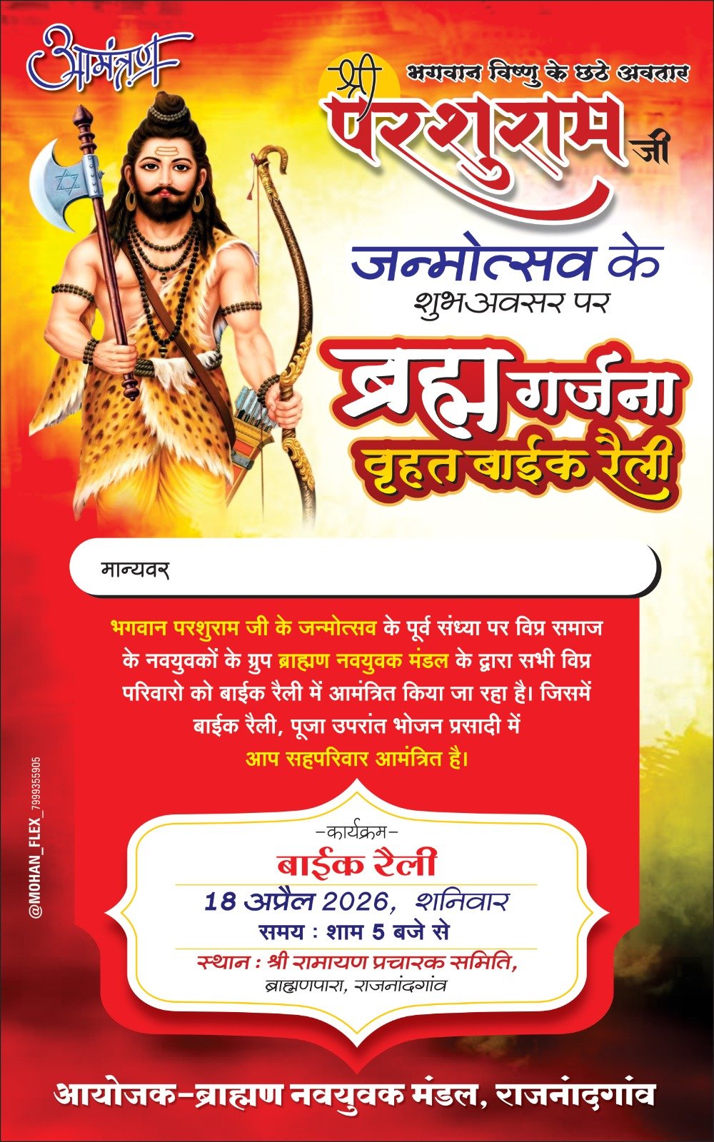 भगवान श्रीपरशुराम जयंती के पावन अवसर पर 18 अप्रैल 2026, शनिवार को नवयुवकब्राह्मण समाज द्वारा शहर में भव्य बाइक रैली का आयोजन किया जाएगा। आयोजन को लेकर समाज में व्यापक उत्साह देखा जा रहा है और तैयारियां अंतिम चरण में हैं।