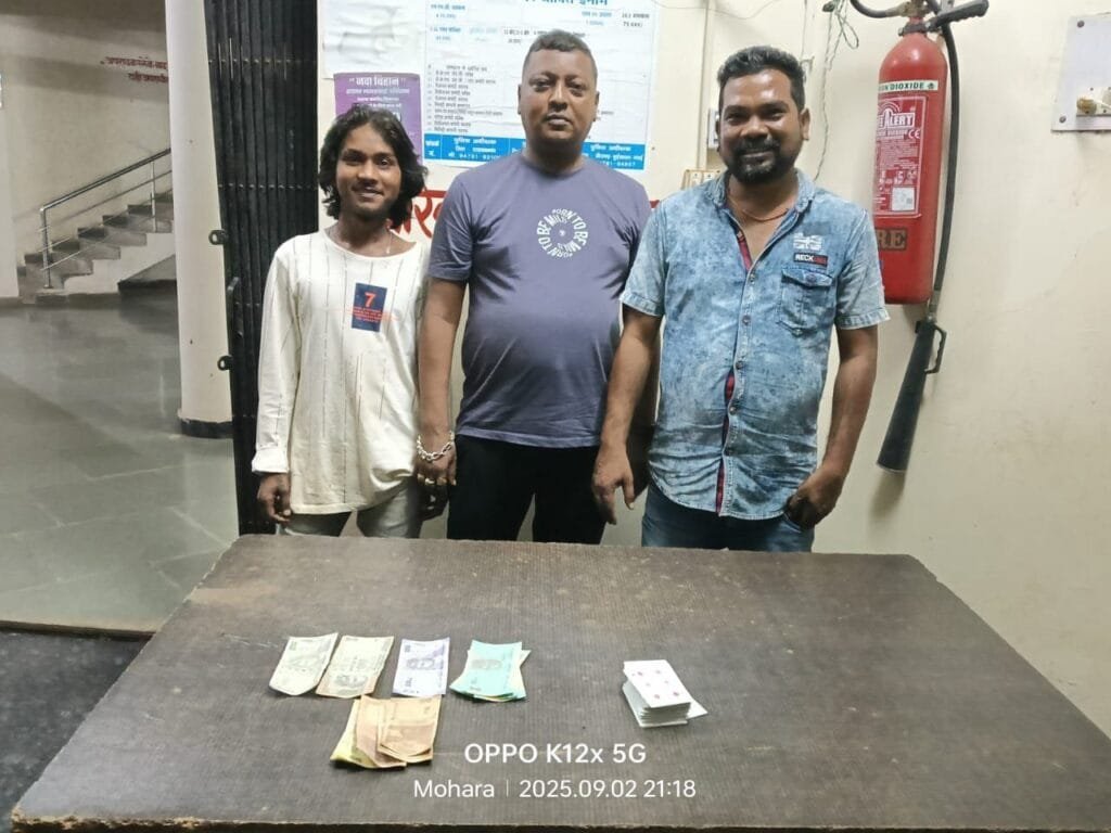 राजनांदगांव. मोहित गर्ग के निर्देशन, अतिरिक्त पुलिस अधीक्षक राहुल देव शर्मा के मार्गदर्शन एवं पुलिस अनुविभागीय अधिकारी डोंगरगढ़ आशीष कुंजाम के पर्यवेक्षण में अवैध शराब बिक्री ,जुआ, सटटा के विरूद्ध चलाये जा रहे अभियान के तहत चौकी प्रभारी मोहारा निरीक्षक ढाल सिंह साहू के नेतृत्व में टीम गठित कर पुलिस चौकी क्षेत्र के ग्राम कसारी में राकेश यादव पिता स्व0 सूनाराम यादव उम्र 40 साल निवासी ग्राम सुकुल दैहान पुलिस चौकी सुकुलदैहान थाना लालबाग जिला राजनांदगांव को अंडा दुकान की आड़ में लोगों को शराब पीने की सुविधा उपलब्ध कराते हुए पाए जाने पर धारा 36 (सी) आबकारी एक्ट के तहत कार्यवाही किया गया तथा रानीगंज रोड बरगद पेड़ के नीचे में 52 पत्ती ताश से रूपये पैसे का दांव लगाकर जुआ खेल रहे जुआरियो की घेराबंदी कर रैडकार्यवाही की गयी जिसमेें जुआरियान 01. राजा श्रीवास पिता स्व० लल्ला श्रीवास उम्र 43 साल निवासी रेवाड़ीह राजनांदगांव 02. उमेश यादव पिता स्व० रामाधार यादव उम्र 38 साल वार्ड नंबर 8 मोतीपुर राजनांदगांव 03. करण साहू पिता स्व0 घनश्याम साहू उम्र 19 साल निवासी ग्राम अर्जुनी थाना डोंगरगांव जिला राजनांगांव छ0ग0 को पकडकर उनके पास एवं फड से नगदी रकम 1040/- रूपयें, 52 पत्ती ताश, 01 नग सफेद प्लास्टिक का बोरी को जप्त कर 13 जुआ एक्ट ,छ0ग0 जुआ प्रतिषेध अधिनियम 2022 की धारा 03 के तहत कार्यवाही किया गया।