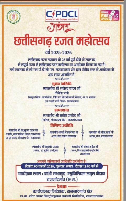 राजनांदगांव में आयोजित होने जा रहे छत्तीसगढ़ रजत जयंती महोत्सव 2025-26 के निमंत्रण पत्र ने अब सियासी तूफान खड़ा कर दिया है। इस भव्य शासकीय आयोजन में विधायक प्रतिनिधि रुपचंद भीमनानी को आमंत्रण नहीं दिया गया, जिससे प्रशासनिक कार्यप्रणाली पर गंभीर सवाल खड़े हो गए हैं।