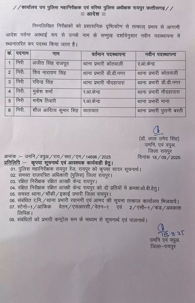 एसएसपी डाॅ. लाल उमेद के द्वारा जारी सूची में निरीक्षक अजीत सिंह राजपूत को थाना प्रभारी कोतवाली से र.आ.केंद्र भेजा गया है। निरीक्षक शिव नारायण सिंह को थाना प्रभारी डीडी नगर से थाना प्रभारी कोतवाली, निरीक्षक रविन्द्र सिंह को थाना प्रभारी मौदहापारा से थाना प्रभारी डीडी नगर, निरीक्षक मुकेश शर्मा को र.आ.केंद्र से थाना प्रभारी मौदहापारा, निरीक्षक मनीष तिवारी को रआ केंद्र से थाना प्रभारी माना और निरीक्षक शील आदित्य कुमार सिंह को यातायात से थाना प्रभारी पुरानी बस्ती भेजा गया है।
