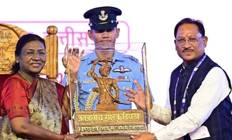 जनजातीय गौरव दिवस समारोह: मुख्यमंत्री साय ने राष्ट्रपति मुर्मु को प्रदान की बिरसा मुंडा की अनोखी बस्तर आर्ट मूर्ति
